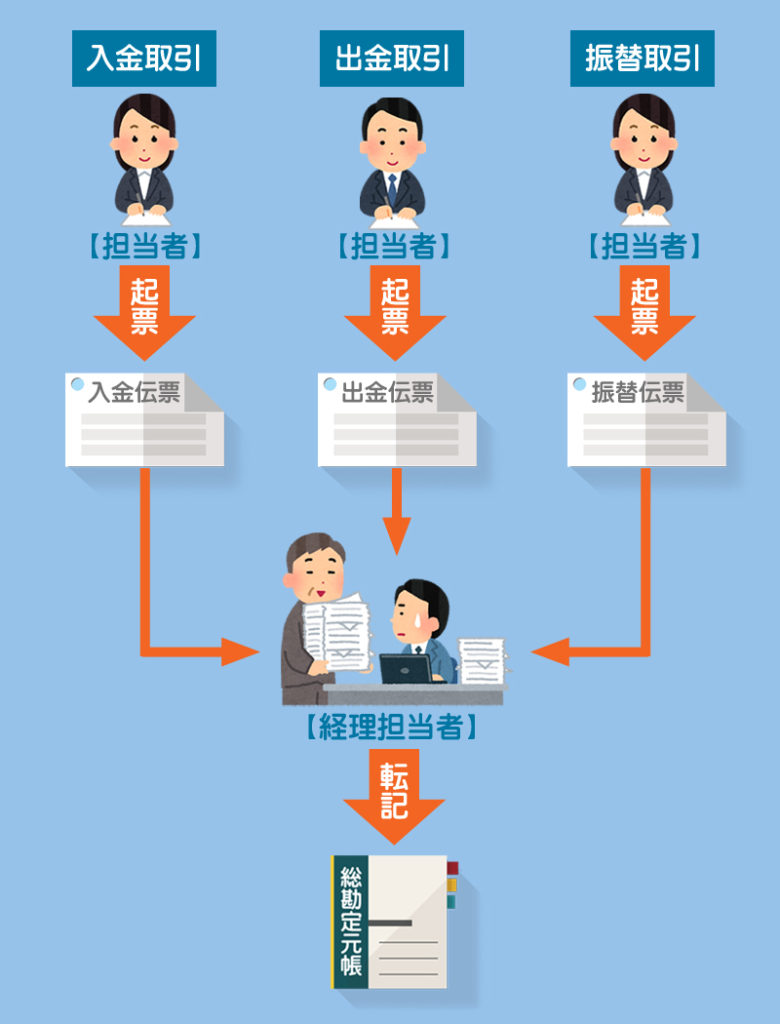 取引が発生すると入金取引は入金伝票へ、出金取引は出金伝票へ、それら以外の取引は振替伝票へ各担当者が記入します。そして、経理担当者が各伝票から総勘定元帳へ転記します。