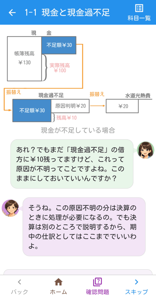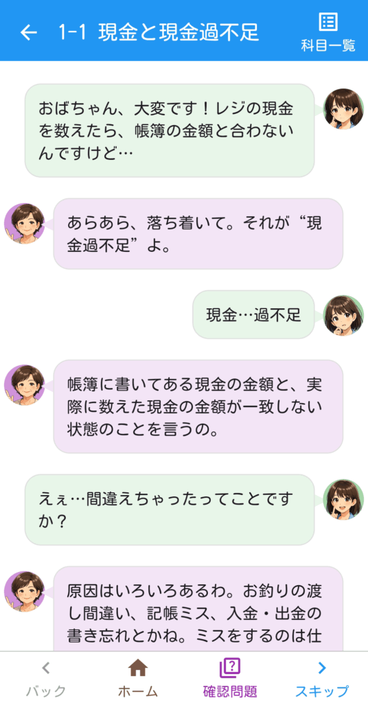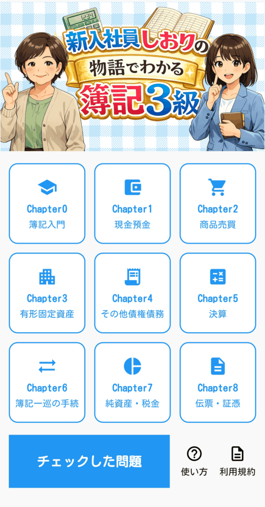 新入社員・高橋しおりと、経理のおばちゃんが繰り広げる会話を通じて、簿記3級の基礎から決算までをやさしく学べるアプリです。「簿記って難しそう…」と思っている方も、物語感覚でスッと理解できます。